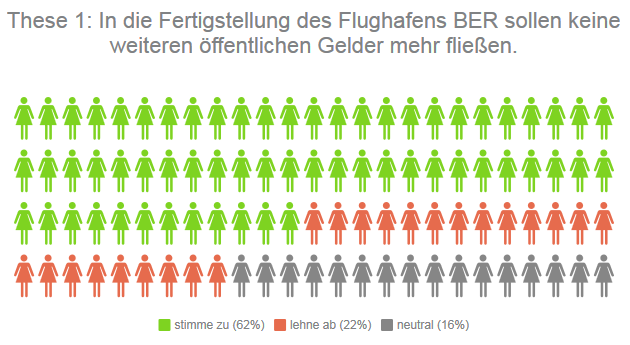 Nur 3 Buchstaben und schon erhitzen sich die Gemüter: BER – seit 2006 im Bau und mehr als umstritten. Immerhin 62 Prozent der teilnehmenden Direktkandidierenden sprechen sich dagegen aus, dass weiterhin öffentliche Gelder in den Bau fließen sollen – aktuell kostet die Baustelle die Steuerzahler:innen mehrere Millionen Euro im Monat.