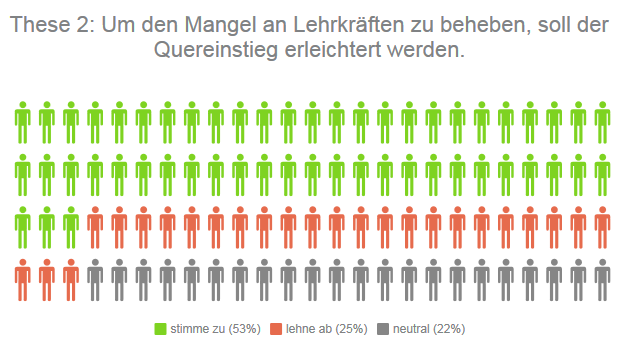 Soll der Quereinstieg in den Lehrberuf erleichtert werden? Insgesamt stimmen 53 Prozent aller Teilnehmenden für die Erleichterung, 25 Prozent lehnen ab, 22 Prozent positionieren sich neutral.