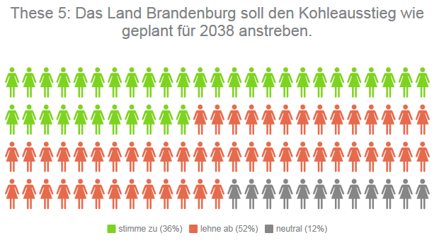 Die höchste Zustimmung kommt von der SPD: 88 Prozent sind für die Einhaltung des Termins in 19 Jahren. Auch die CDU und BVB/Freie Wähler sind mit 65 bzw. 59 Prozent für die These. Ein Viertel der CDU-Kandidierenden positioniert sich jedoch auch neutral in der Frage.
