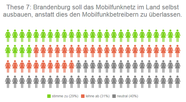 29 Prozent sind insgesamt dafür, dass das Land die Zügel in die Hand nehmen solle. Die höchste Zustimmung kommt aus der CDU, wo 42 Prozent der Direktkandidierenden das Projekt ans Land übergeben wollen. Die höchste Ablehnung aus einer Partei kommt von der FDP – 81 Prozent sprechen sich dafür aus, den Mobilfunkausbau bei den Telekommunikationsunternehmen zu belassen. Auch jeweils ca. ein Drittel der BVB/Freien Wähler (39 Prozent), CDU (35 Prozent) und SPD (32 Prozent) sowie noch ein Viertel der AfD-Kandidierenden (23 Prozent) sind gegen die These.