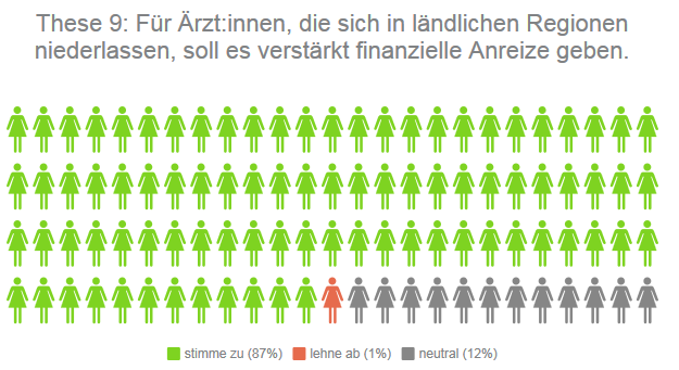 Der demografische Wandel bedeutet auch infrastrukturelle Probleme wie den Mangel an Ärzt:innen auf dem Land. Eine überwältigende Mehrheit von 87 Prozent aller Direktkandidierenden möchte finanzielle Anreize schaffen, damit Ärzt:innen sich verstärkt auch in strukturschwachen Gegenden niederlassen.