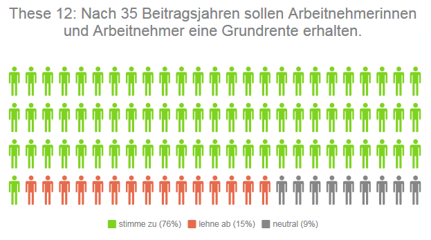 Lediglich die FDP lehnt die Grundrente zu 76 Prozent ab, nur 14 Prozent der teilnehmenden Direktkandidierenden sind dafür.