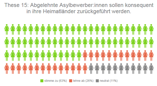 Die Kandidierenden der CDU und AfD sind jeweils zu 100 Prozent für die These und fordern damit die konsequente Abschiebung. Auch die FDP- und SPD-Kandidierenden sind mit 92 bzw. 88 Prozent nahezu vollständig dafür. Bei den BVB/Freien Wählern sind es immerhin noch 76 Prozent.