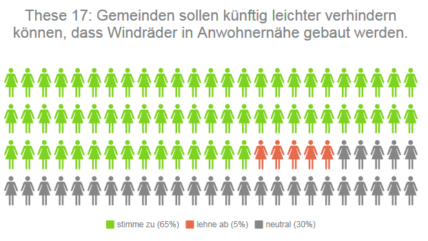 Die Grünen und die Linkspartei wählen bevorzugt neutral – zu 84 und 77 Prozent. Die Grünen wollen zentral dafür sorgen, dass ein fester Anteil des Landes bebaut wird – weit genug entfernt von Gemeinden. Die Linkspartei befindet, dass bereits ausreichend Gemeinderechte gestärkt wurden.