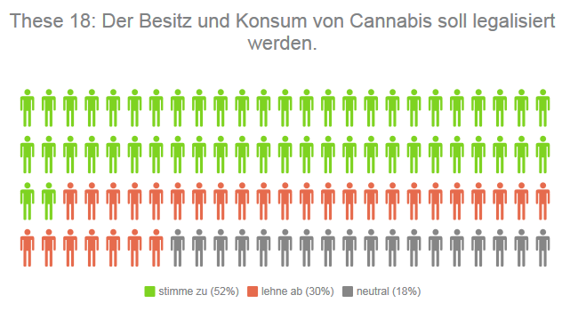 Die Linkspartei stimmt der Legalisierung zu 95 Prozent zu, die FDP mit 81 Prozent, die Grünen mit 77 Prozent. Erwartet wenig Zustimmung kommt aus der CDU, nur 12 Prozent der teilnehmenden Direktkandidierenden sind für eine Freigabe.