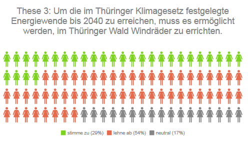 Windräder sind Teil der Energiewende – aber dürfen sie auch im Thüringer Wald aufgestellt werden? Mehr als die Hälfte (54 Prozent) der teilnehmenden Direktkandidierenden sagt: Nein, der Thüringer Wald soll nicht bebaut werden, auch wenn dadurch die im Thüringer Klimagesetz festgelegte Energiewende nicht bis 2040 erreicht wird. 29 Prozent der Kandidierenden finden: Doch, der Schritt ist nötig. 17 Prozent positionieren sich neutral.