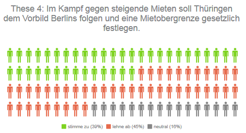 Berlin will es vormachen – soll Thüringen folgen? Soll es eine Mietobergrenze geben, damit die steigenden Mieten eingefangen werden können? Das Thema spaltet auch die Kandidierenden: 39 Prozent wollen die Maßnahme umsetzen, 45 Prozent lehnen sie ab.