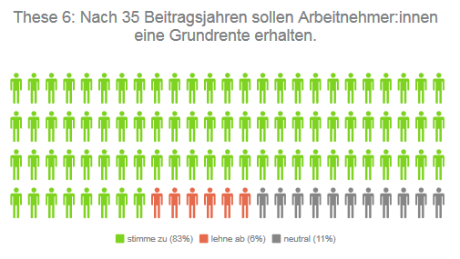 Die höchste Ablehnung kommt gerade noch aus der FDP mit 30 Prozent, wobei hier auch ein Drittel der Kandidierenden für die Grundrente nach 35 Jahren ist; 38 Prozent der Liberalen positionieren sich neutral.
