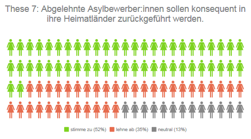 Die Kandidierenden der AfD sind zu 100 Prozent für die These und fordern damit die konsequente Abschiebung. Auch die Kandidierenden von CDU, Freien Wählern und FDP sind mit jeweils 93, 91 und 88 Prozent nahezu vollständig dafür. Bei der SPD sind es immerhin noch 59 Prozent, wobei sich hier auch 31 Prozent neutral positionieren.
