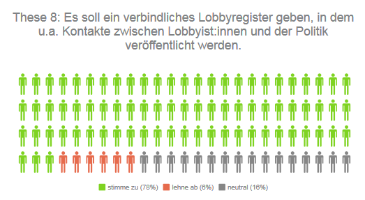 These 8: Es soll ein verbindliches Lobbyregister geben, in dem u.a. Kontakte zwischen Lobbyist:innen und der Politik veröffentlicht werden.