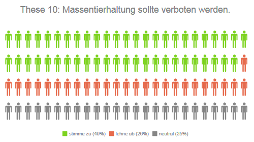 Auch 34 Prozent der AfD (bei 21 Prozent Zustimmung, 45 Prozent Ablehnung der These) und 33 Prozent der FDP (18 Prozent Zustimmung / 50 Prozent Ablehnung) legen sich in der Frage nicht fest. Bei den Freien Wählern sind es 36 Prozent, wobei hier eine Mehrheit von 55 Prozent für das Verbot der Massentierhaltung stimmt.