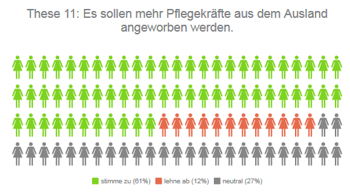 Die meisten Pflegeeinrichtungen in Deutschland sind unterbesetzt – sollen Pflegekräfte aus dem Ausland angeworben werden, um das Problem zu mindern oder sogar zu beheben? 61 Prozent aller teilnehmenden Direktkandidierenden sagen: ja.