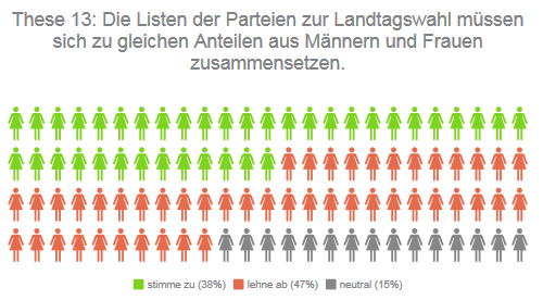 Sollen Listen der Parteien zur Landtagswahl sich zu gleichen Anteilen aus Männern und Frauen zusammensetzen? Wie finden die Direktkandidierenden dies? Das Gesamtergebnis ist gemischt: 38 Prozent stimmen zu, 47 Prozent dagegen, 15 Prozent wählen "neutral" aus.