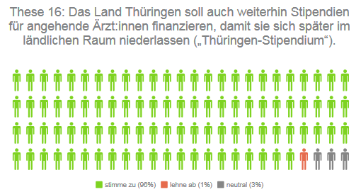 Auf dem Land, aber auch in Städten fehlt es häufig an neuen Ärzt:innen, die die Grundversorgung sicher stellen können. Das Land Thüringen vergibt seit 2010 das sogenannte "Thüringen-Stipendium", um dagegen anzuwirken. Nur vereinzelte Direktkandidierende finden, das diese Praxis ausgesetzt werden sollte.
