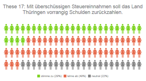 Schuldentilgung oder Investionsschub? Die uralte Frage in Volkswirtschaften treibt nicht nur die Bundesregierung um, sondern auch das finanziell angestrengte Thüringen. 29 Prozent der teilnehmenden Direktkandidierenden finden, dass mit überschüssigen Steuereinnahmen Schulden beglichen werden sollen, 49 Prozent lehnen die These ab.