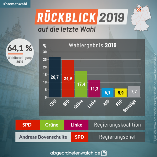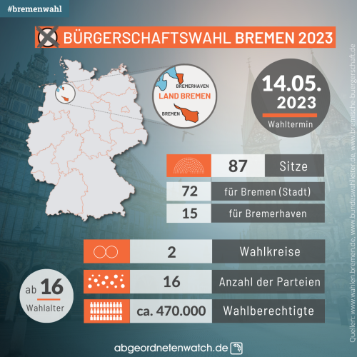 Nur rund eine halbe Millionen Wahlberechtigte – Das kleinste Bundesland Deutschlands hat die Wahl! Am 14. Mai wählen die Bürger:innen in Bremen und Bremerhaven ihre neue Bürgerschaft. Wie ist die Ausgangslage? In diesem Artikel haben wir für Sie wie gewohnt die Eckdaten der anstehenden Wahl und Ergebnisse der letzten Bürgerschaftswahl zusammengefasst