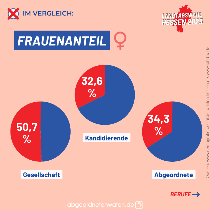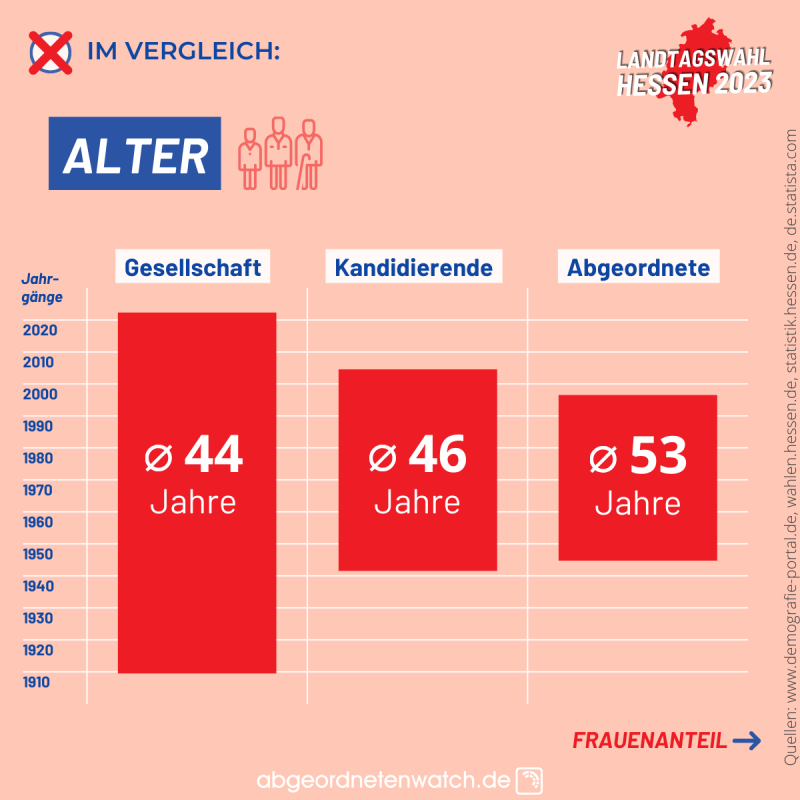 Im Altersvergleich liegen die aktuellen Abgeordneten etwas über dem Durchschnittsalter der Bevölkerung. Das durchschnittliche Alter der Kandidierenden repräsentiert schon eher das der gesamten Bevölkerung in Hessen. Dabei muss man natürlich bedenken, dass die Altersspanne in der Gesellschaft anders verteilt ist als im Landtag – schließlich findet man dort weder Babys noch Hundertjährige. In puncto Frauenanteil haben die Wahlkreisbewerber:innen noch eine große Lücke zu füllen, gerade einmal ein Drittel der Kandidierenden in Hessen sind Frauen. Nicht viel besser ist der Frauenanteil unter den aktuellen Abgeordneten, hier liegt der Anteil bei 34 Prozent.