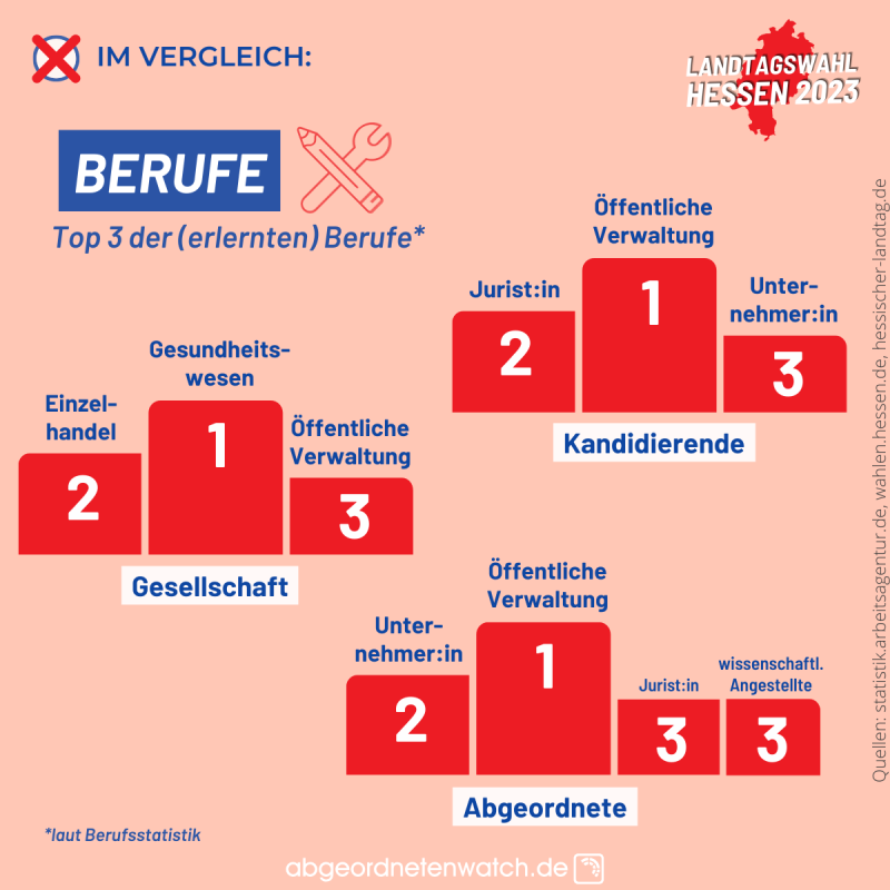 Auch wenn es um die gelernten Berufe geht, gibt es einen erkennbaren Unterschied zwischen der gesamtem Bevölkerung, den Abgeordneten und den Wahlkreisbewerber:innen. In Hessen arbeiten die meisten Bürger:innen im Gesundheitswesen, gefolgt vom Einzelhandel und der öffentlichen Verwaltung. Letztere umfasst u. a. Bürgerämter, Bezirksregierungen, Gefängnisse, Ministerien, Museen, Stadtwerke, Krankenkassen, Polizei und Bundeswehr. Bei den Abgeordneten und Wahlkreisbewerber:innen unterscheiden sich die Berufe von der Gesellschaft, sie ähneln sich untereinander aber sehr. Hier stehen auf dem ersten Platz die öffentliche Verwaltung, gefolgt von Jurist:innen auf dem zweiten Platz. Den dritten Platz teilen sich Unternehmer:innen und wissenschaftliche Angestellte.