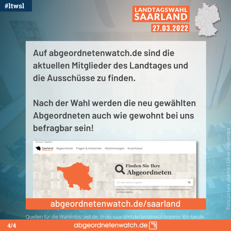 Fragen an die aktuellen Abgeordneten im Landtag des Saarlandes? Dann schauen Sie gerne auf dem Frageportal zum Bundesland vorbei und stellen Sie sie direkt an die jeweiligen Abgeordneten.