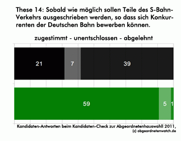 Ausschreibung bei der S-Bahn Kandidaten-Check-These: Sobald wie möglich sollen Teile des S-Bahn-Verkehrs ausgeschrieben werden, so dass sich Konkurrenten der Deutschen Bahn bewerben können. Während die Grünen sich beinahe geschlossen für eine Ausschreibung bei der S-Bahn aussprechen, sind zwei Drittel der SPD-Kandidaten dagegen.