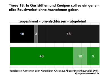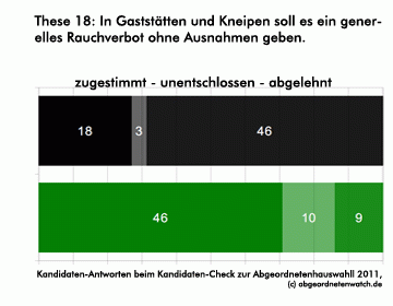 Rauchverbot Kandidaten-Check-These: In Gaststätten und Kneipen soll es ein generelles Rauchverbot ohne Ausnahmen geben. Gegensätzliche Positionen auch beim Thema Rauchverbot: Hier stehen sich bei SPD und Grünen zwei etwa gleich große Gruppen gegenüber. Von den Direktkandidaten der Grünen sprechen sich zwei Drittel für ein generelles Rauchverbot ohne Ausnahmen aus, beinahe ebensoviele SPD-Kandidaten nehmen die gegensätzlich Position eine.