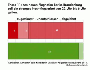 Nachtflugverbot am neuen Großflughafen BBI: Kandidaten-Check-These: Am neuen Flughafen Berlin-Brandenburg soll ein strenges Nachtflugverbot von 22 Uhr bis 6 Uhr gelten. Während die Grünen beinahe geschlossen für ein strenges Nachtflugverbot am neuen Großflughafen eintreten, lehnen dieses drei von vier SPD-Kandidaten ab. Anders als die Direktkandidaten der Grünen vermeidet die Partei in ihrem Wahlprogramm übrigens eine Festlegung in Sachen Nachtflugverbot. Auf Seite 72 heißt es: