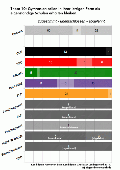 These 10: Gymnasien sollen in ihrer jetzigen Form als eigenständige Schulen erhalten bleiben. Höchst kontrovers wird das Thema Gymnasien innerhalb von SPD und Linken gesehen. Während es unter den Kandidaten der Linken weder eine absolute Mehrheit für noch gegen eine Beibehaltung von Gymnasien in der jetzigen Form gibt, präferieren die Kandidierenden der SPD zwar mehrheitlich das Gymnasium als eigenständige Schulform. Allerdings ist ein Drittel entweder dagegen oder unentschlossen.