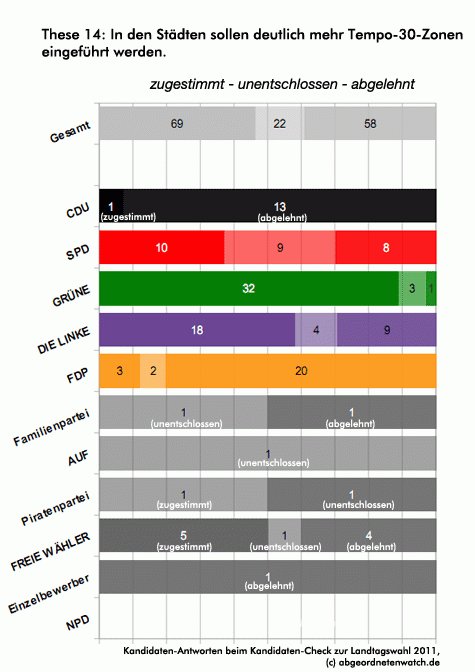 These 14: In den Städten sollen deutlich mehr Tempo-30-Zonen eingeführt werden. Innerhalb der SPD ist die Meinung beim Thema „Tempo 30-Zonen“ dreigeteilt. Etwa ein Drittel fordert deren Ausweitung, ein weiteres Drittel ist dagegen, die übrigen Kandidaten sind hier unentschlossen. Auch bei den Linken gehen die Meinungen auseinander. Etwas mehr als die Hälfte der Kandidaten spricht sich für mehr Tempo 30-Zonen aus, während gut ein Viertel dagegen ist. Bei den Grünen und der CDU sticht jeweils ein einzelner Kandidat hervor, der konträr zur Mehrheit seiner Parteikollegen steht.