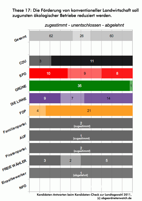 These 17: Die Förderung von konventioneller Landwirtschaft soll zugunsten ökologischer Betriebe reduziert werden. Erneut sind es SPD und Linke, bei denen die Meinungen parteiintern deutlich auseinandergehen. Gut ein Drittel der SPD-Kandidaten spricht sich für eine Reduzierung der Fördermittel für die konventionelle Landwirtschaft zugunsten ökologischer Betriebe aus, ein weiteres Drittel lehnt diese Forderung ab, die übrigen Kandidaten sind unentschlossen. Ein Drittel der Linke-Kandidaten ist für eine Streichung der Fördermittel, knapp die Hälfte stimmt dieser Forderung nicht zu, etwa ein Viertel ist hier unentschlossen.