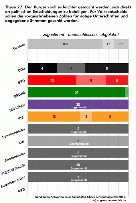 These 27: Den Bürgern soll es leichter gemacht werden, sich direkt an politischen Entscheidungen zu beteiligen. Für Volksentscheide sollen die vorgeschriebenen Zahlen für nötige Unterschriften und abgegebene Stimmen gesenkt werden. Nur Linke und Grüne haben einen einheitlichen Standpunkt zum Thema Beteiligungsquoren bei Volksentscheiden. Mit Ausnahme eines Grünen-Kandidaten sprechen sich beide Parteien für deren Senkung aus. Bei FDP und SPD teilt diese Position zwar ebenfalls eine Mehrheit der Kandidierenden, allerdings ist Gruppe der Gegner von geringeren Quoren in beiden Parteien überraschend groß.