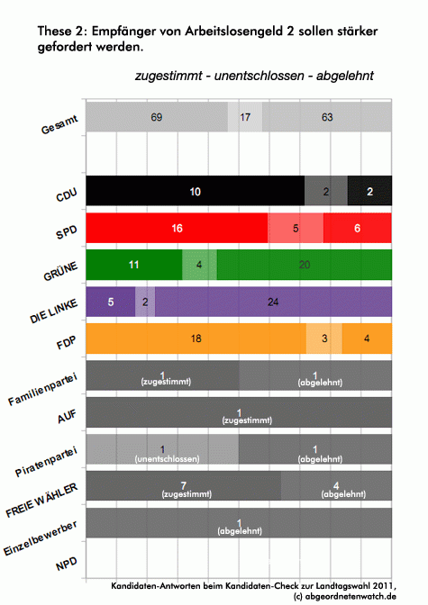 These 2: Empfänger von Arbeitslosengeld 2 sollen stärker gefordert werden. In keiner Partei gibt es eine vollkommene Übereinstimmung in dieser Frage, am wenigsten bei den Grünen und der SPD. Von den Kandidaten der Bündnisgrünen lehnt knapp die Hälfte die Forderung ab, Hartz IV-Empfängern stärker zu fordern, etwa ein Drittel schließt sich der These an, der Rest ist unentschlossen. Ein ähnliches Bild bei der SPD, dort allerdings unter umgekehrten Vorzeichen. Während etwas mehr als die Hälfte der Kandidaten ALG2-Empfänger künftig stärker fordern will, spricht sich jeder Fünfte dagegen aus.