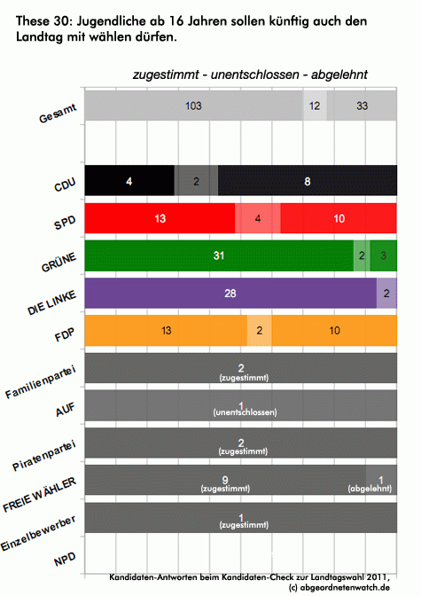 These 30: Jugendliche ab 16 Jahren sollen künftig auch den Landtag mit wählen dürfen. Während sich die Kandidaten von Linken und Grünen beinahe einhellig für das Wahlrecht ab 16 aussprechen, tun sich die Wahlbewerber die übrigen Parteien in dieser Frage schwer. Bei SPD sind knapp die Hälfte der Kandidaten ebenfalls für eine Herabsetzung des Wahlalters, aber gut ein Drittel dagegen, der Rest unentschlossen. Von den FDP-Kandidaten spricht sich eine knappe Mehrheit dafür aus, dass 16jährige zur Wahl gehen dürfen, etwas mehr als ein Drittel der Kandidaten ist dagegen. Nur in der CDU gibt es eine Mehrheit gegen eine Änderung des Wahlalters.
