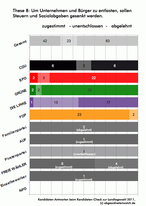 These 8: Um Unternehmen und Bürger zu entlasten, sollen Steuern und Sozialabgaben gesenkt werden. Während FDP (Ja), SPD und Grüne (Nein) sich in Sachen Steuersenkung weitgehend einig sind, ergibt sich insbesondere bei der Linkspartei ein uneinheitliches Bild. Knapp die Hälfte der Kandidaten sind gegen eine Absenkung von Steuern und Sozialabgaben, eine weitere große Gruppe ist in dieser Frage unentschlossen. Im Fall der CDU ist die Aussagekraft aufgrund der geringen Teilnahmequote zwar eher gering, doch auch hier zeigt sich ein geteiltes Bild. Sechs der 37 Kandidaten sprechen sich für, weitere sechs gegen Steuersenkungen aus.