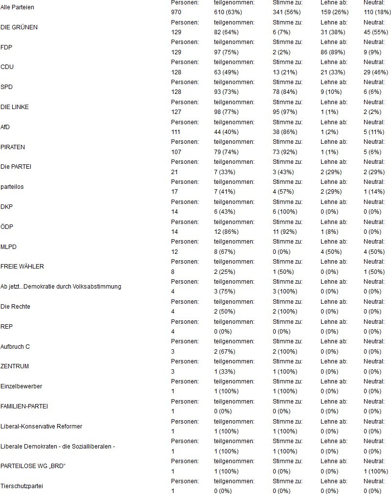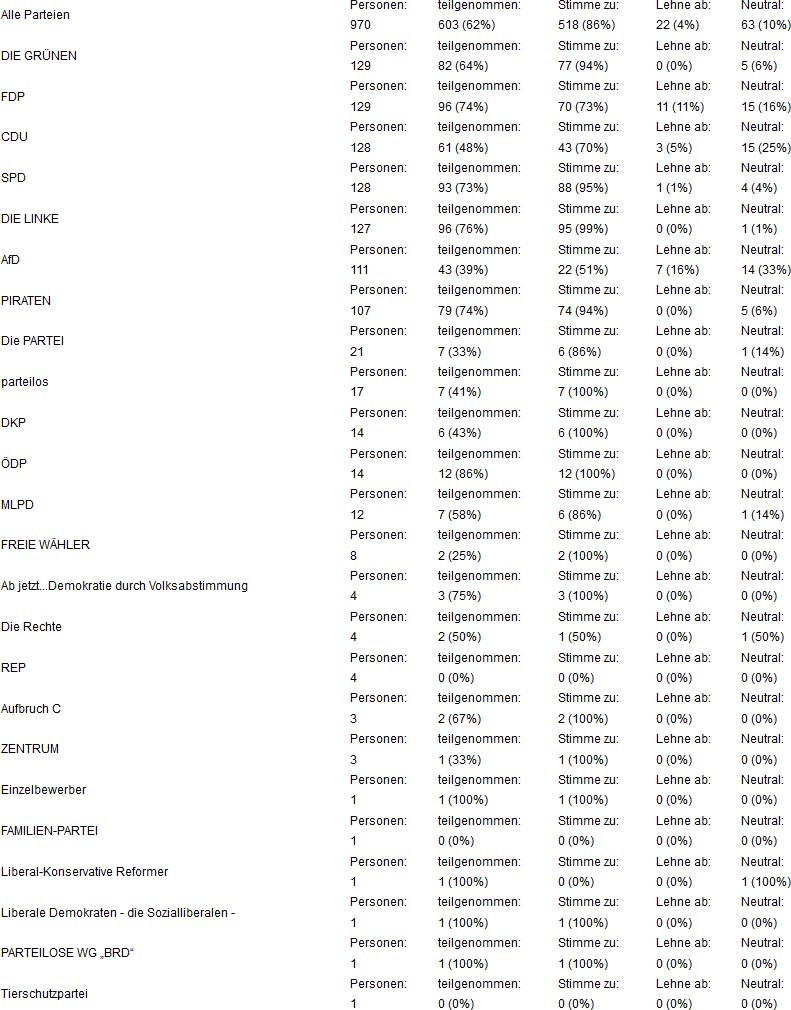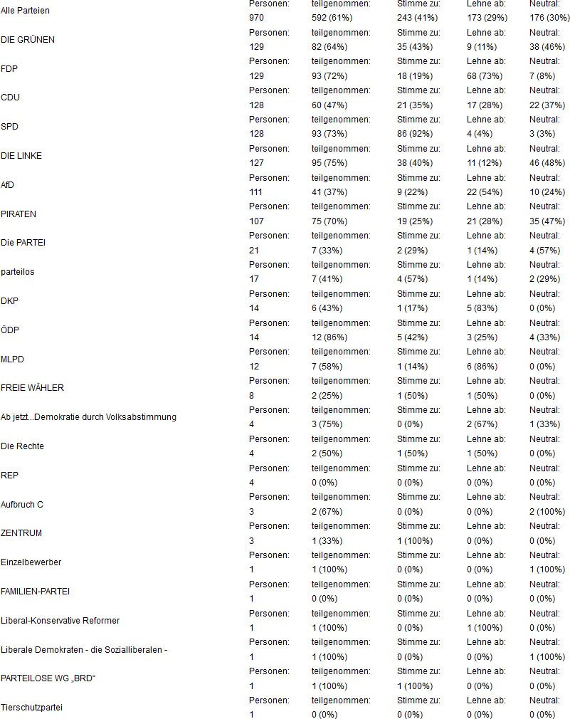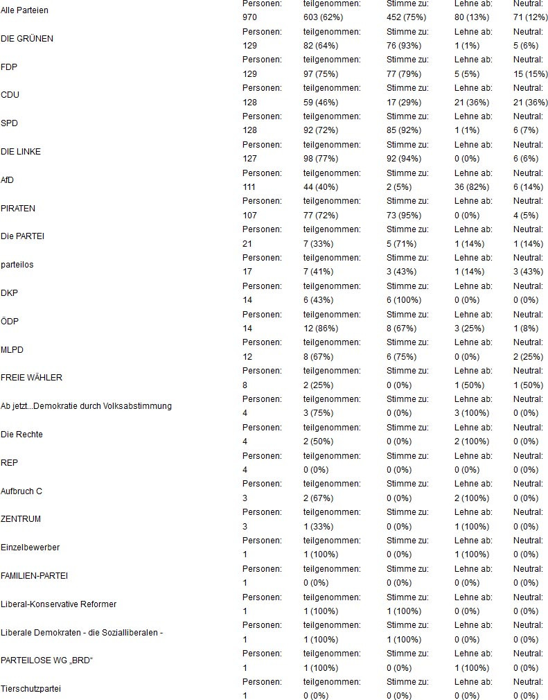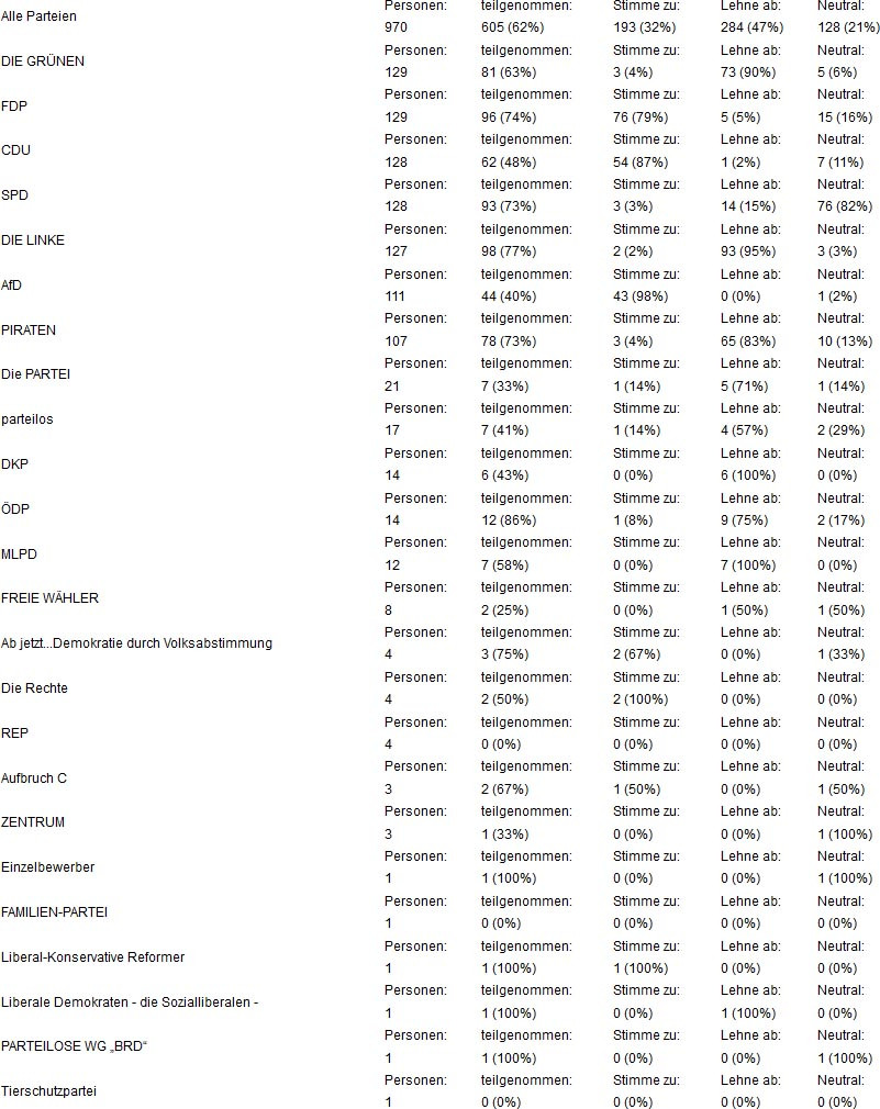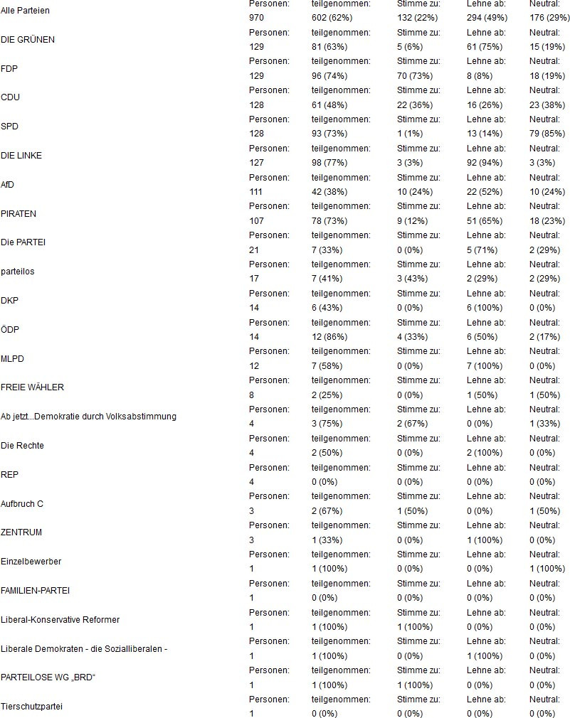 Neben den individuellen Standpunkten der Wahlbewerberinnen und Wahlbewerber ist aber auch das Ergebnis nach Parteien interessant: Wie positionieren sich beispielsweise die Kandidierenden der SPD zu der Frage, ob Politikerinnen und Poliker aus den Gremien des öffentlich-rechtlichen Rundfunks ausgeschlossen werden sollen? Aus welchen Parteien kommen die 22 Kandidierenden, die dagegen sind, dass für die Folgekosten des Braunkohleabbaus die Konzerne aufkommen? Welche Thesen scheinen innerhalb von CDU oder Grünen besonders umstritten?