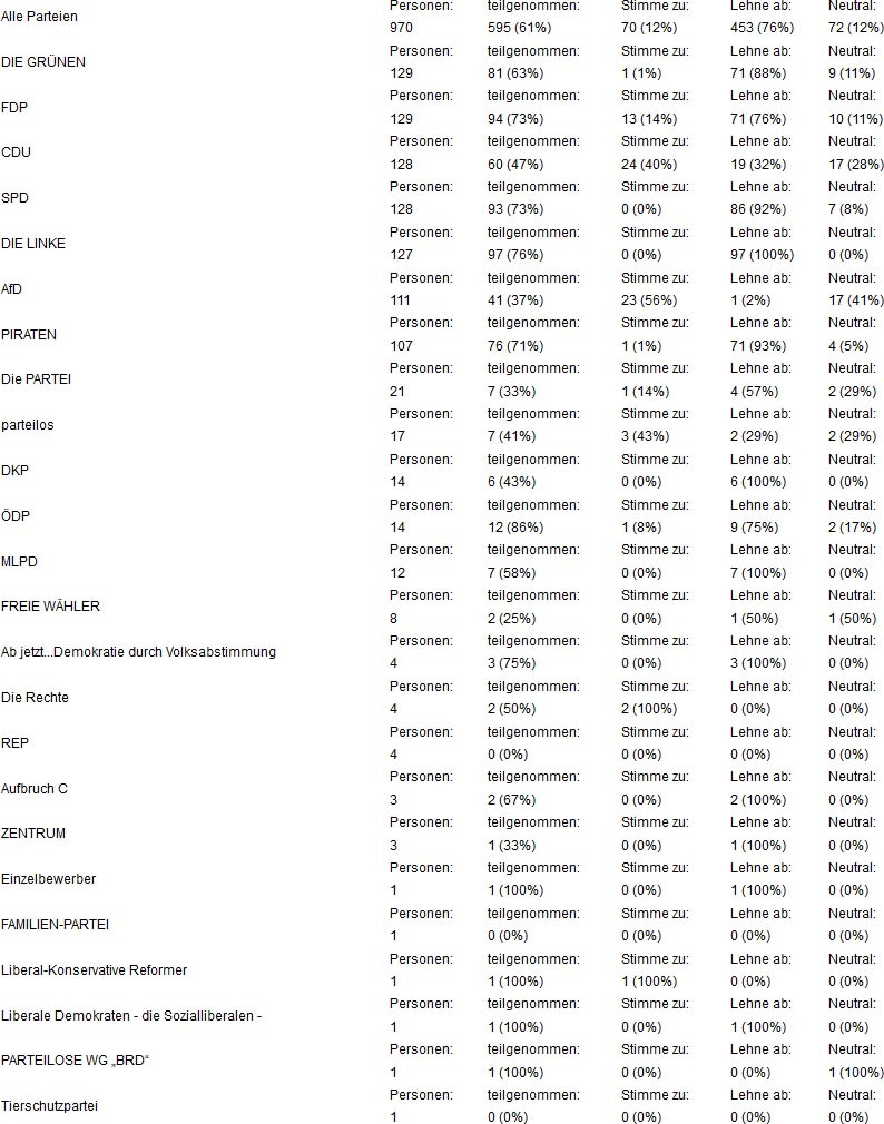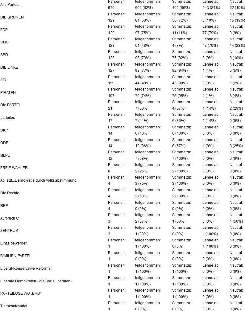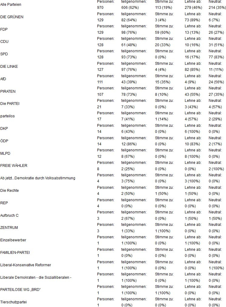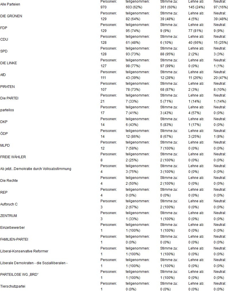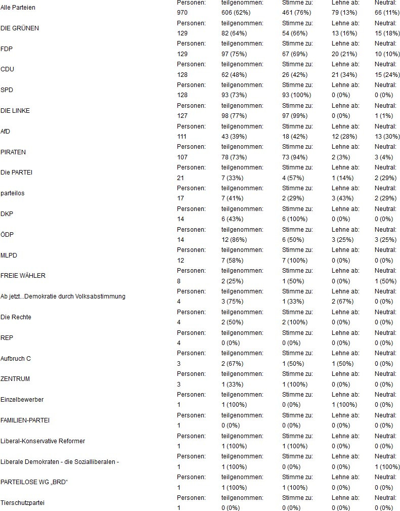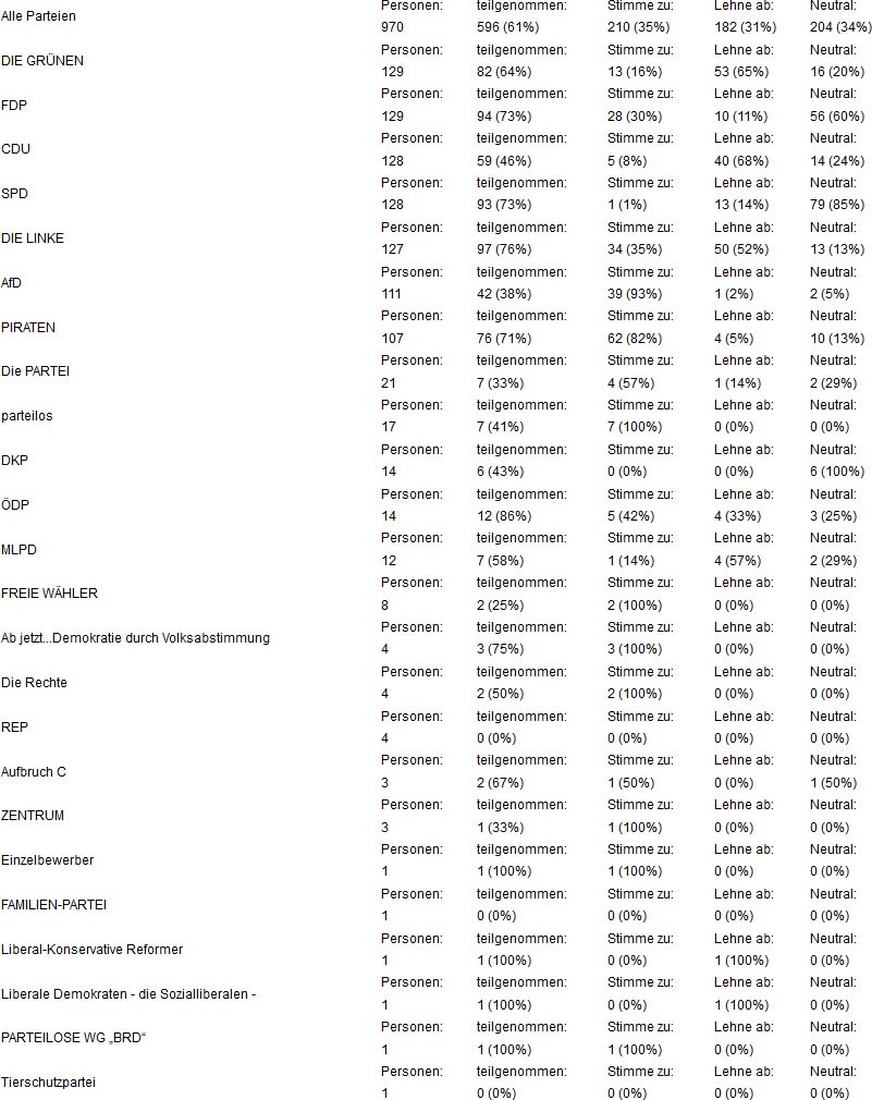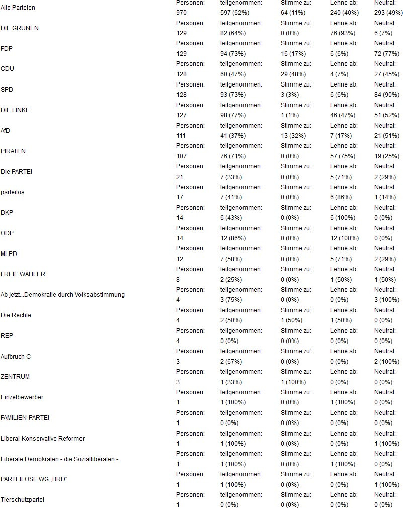 Neben den individuellen Standpunkten der Wahlbewerberinnen und Wahlbewerber ist aber auch das Ergebnis nach Parteien interessant: Wie positionieren sich beispielsweise die Kandidierenden der SPD zu der Frage, ob Politikerinnen und Poliker aus den Gremien des öffentlich-rechtlichen Rundfunks ausgeschlossen werden sollen? Aus welchen Parteien kommen die 22 Kandidierenden, die dagegen sind, dass für die Folgekosten des Braunkohleabbaus die Konzerne aufkommen? Welche Thesen scheinen innerhalb von CDU oder Grünen besonders umstritten?