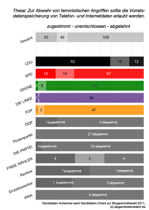 Vorratsdatenspeicherung: Vor allem unter den Kandidaten der beiden Volksparteien wird dieses Thema kontrovers gesehen. Von den CDU-Kandidaten stimmen 62 der These zu, dass "zur Abwehr von terroristischen Angriffen die Vorratsdatenspeicherung von Telefon- und Internetdaten erlaubt werden" sollte. 12 Kandidierende sprechen sich gegen die Vorratsdatenspeicherung zur Terrorabwehr aus, 16 sind in dieser Frage unentschlossen. Bei der SPD zeigt sich ein umgekehrtes Bild: Eine Mehrheit von 67 Kandidaten will keine Datenspeicherung auf Vorrat. 19 Kandidierende sprechen sich jedoch dafür aus, 18 sind hier unentschlossen. Einzig die Piraten und die Kandidierenden der WNA lehnen die Vorratsdatenspeicherung geschlossen ab.