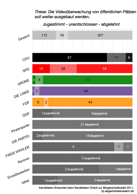 Videoüberwachung: Auch bei der Frage zur Videoüberwachung auf öffentlichen Plätzen sind die Positionen innerhalb von SPD und CDU uneinheitlich. 18 SPD-Kandidaten sprechen sich für einen Ausbau der Videoüberwachung aus, 58 sind dagegen, 28 unentschlossen. Von den CDU-Kandidaten sind 67 für eine stärkere Kameraüberwachung des öffentlichen Raums, 6 sprechen sich dagegen aus, 17 sind unentschlossen. Als einzige Partei sind die Piraten geschlossen gegen eine schärfere Videoüberwachung.