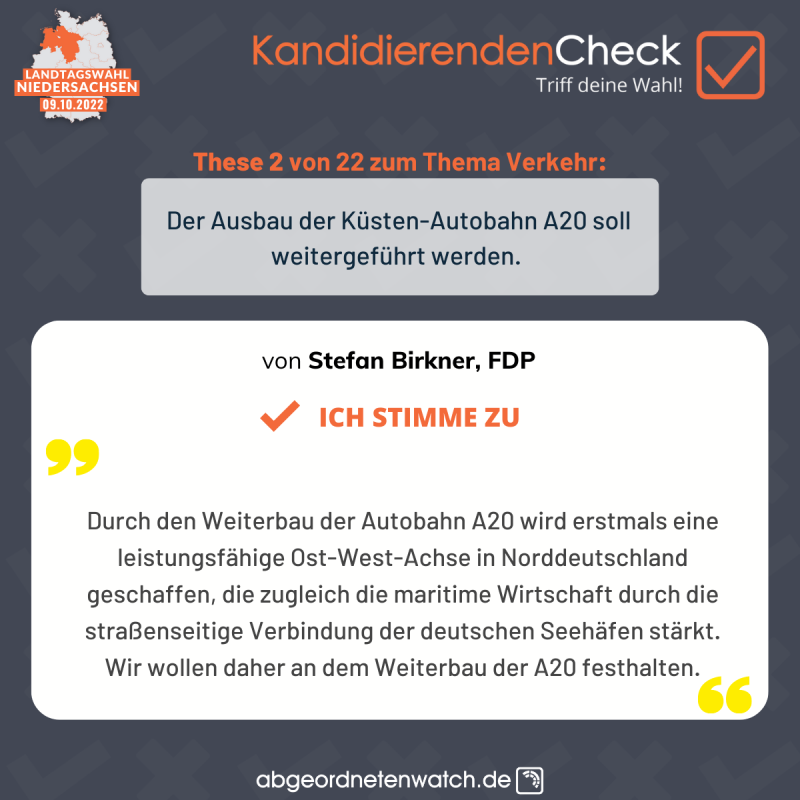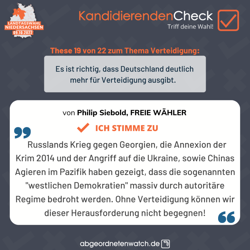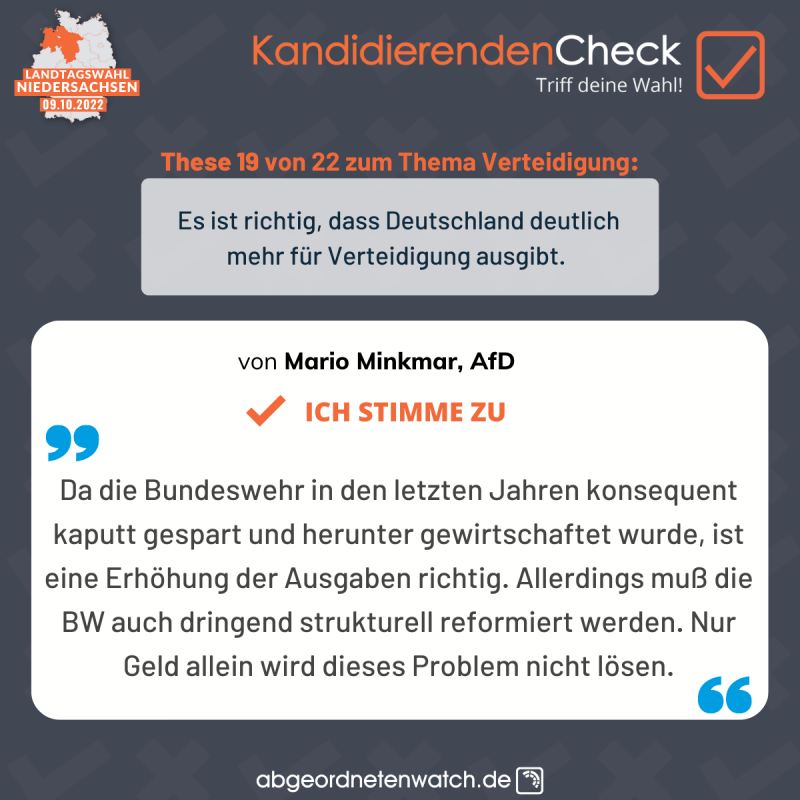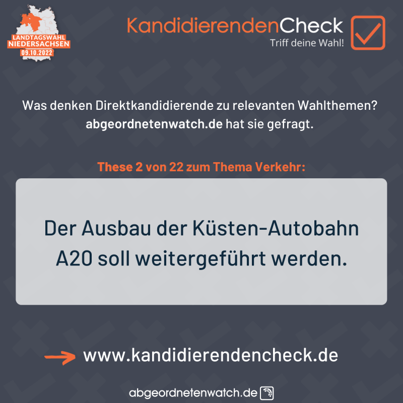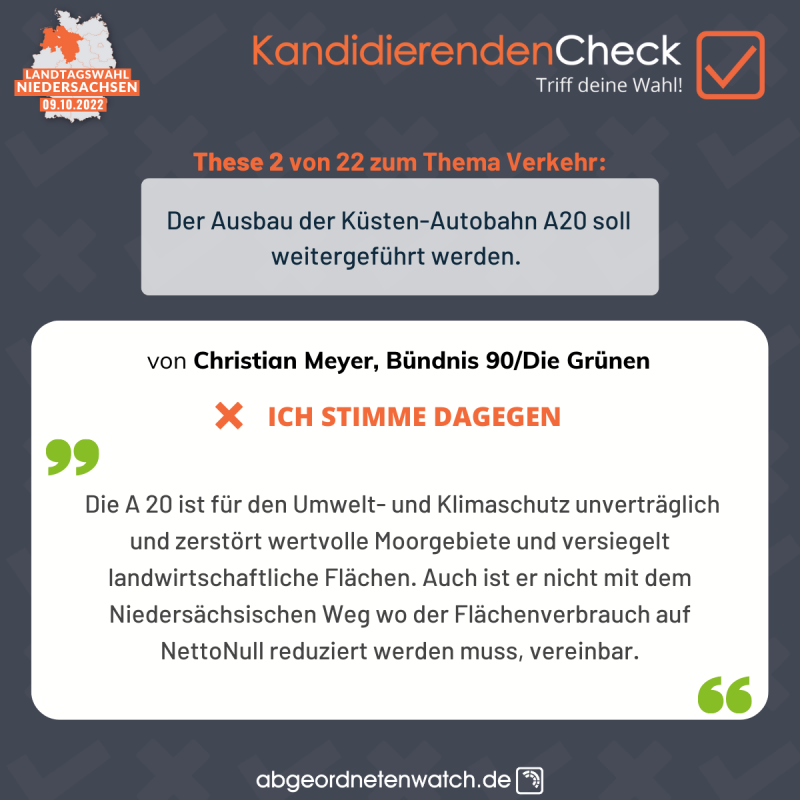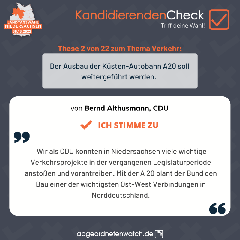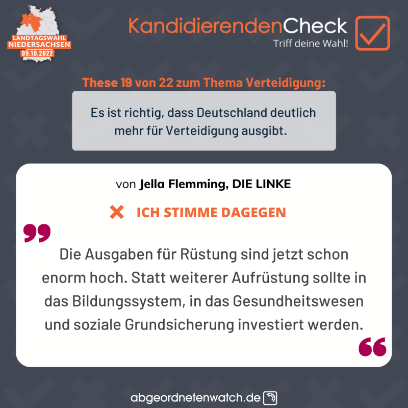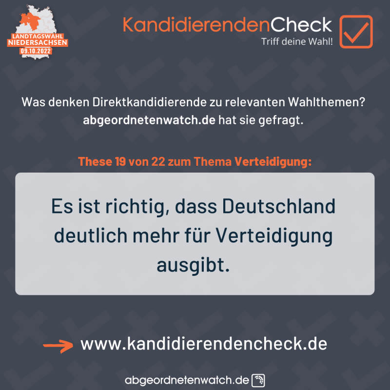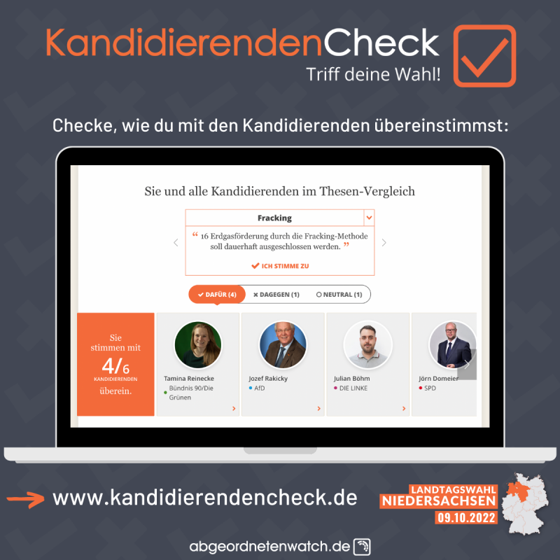 Viele Direktkandidierende haben an unserem Kandidierenden-Check zur Landtagswahl in Niedersachsen teilgenommen. Aber wie begründen sie ihre Haltungen in unserem Kandidierenden-Check? Wir vergleichen ausgewählte Erklärungen der Direktkandidierenden!