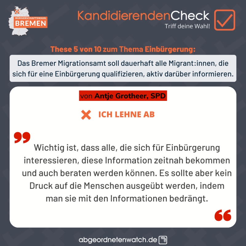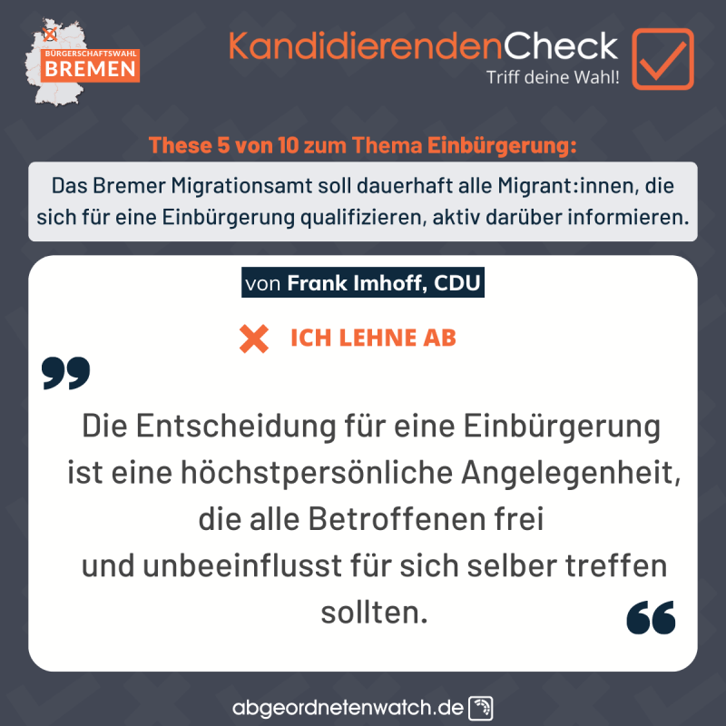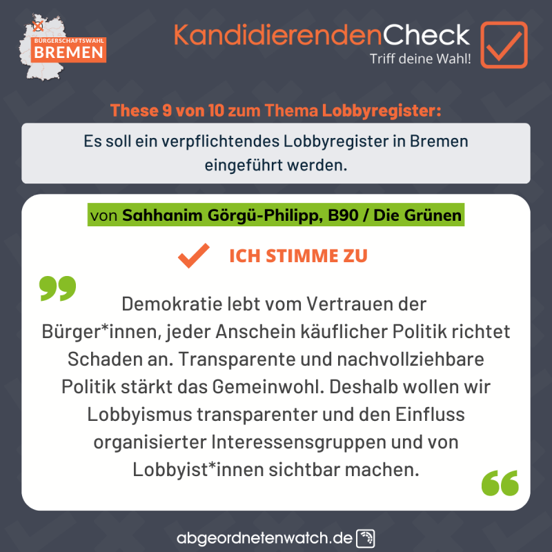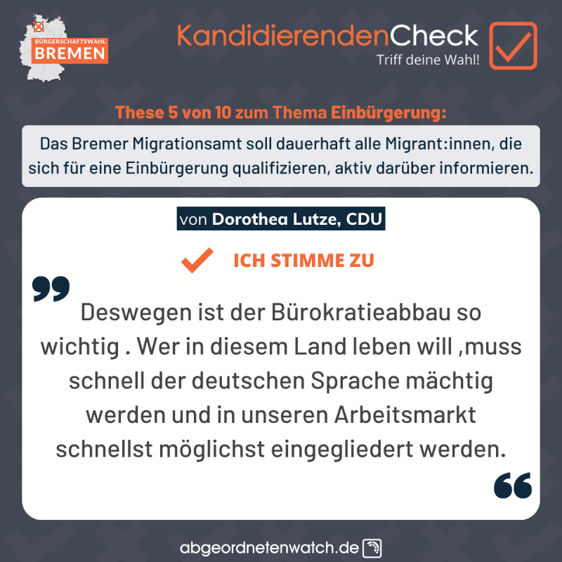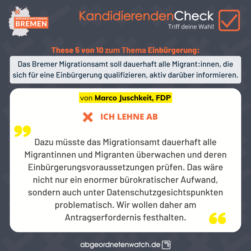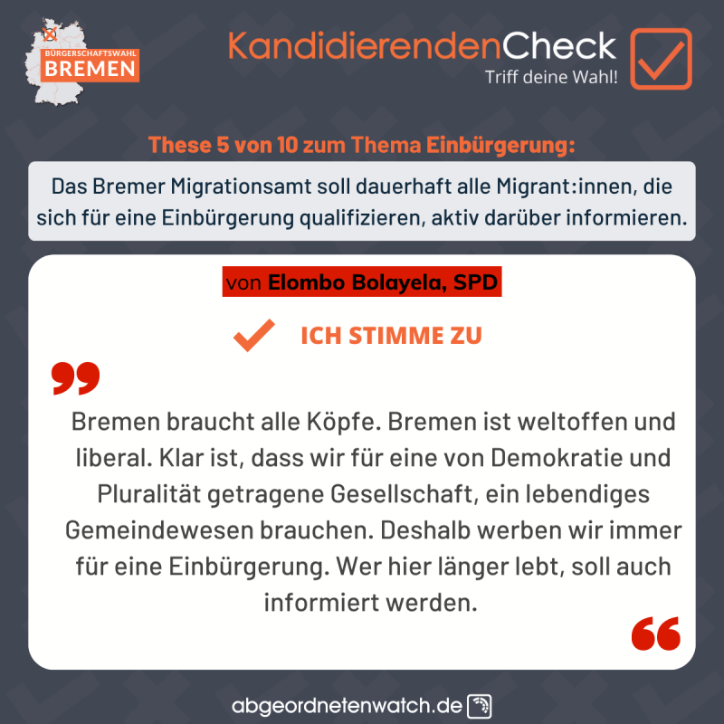 Am 14. Mai wählt Bremen eine neue Bürgerschaft. In unserem Kandidierenden-Check positionieren sich die Wahlbewerber:innen zu zehn relevanten Thesen für Bremen. Ob sozialer Wohnungsbau, der Umgang mit Drogenkonsum oder die Weservertiefung - auch parteiintern herrscht nicht immer Einigkeit. Eine kleine Auswahl der Antworten finden Sie hier!