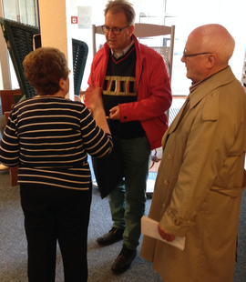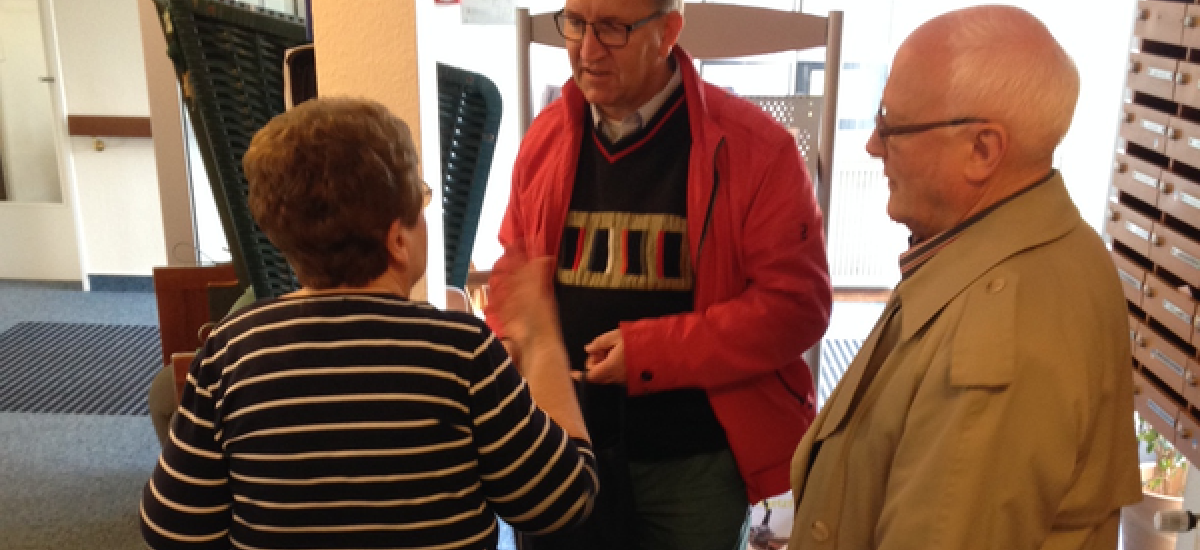 Im Pflegeheim hat Bensch mal als Schüler gearbeitet, das betont er immer wieder in den Gesprächen mit den Bewohnern. Er kennt hier jeden, sagt er und unterbricht Gespräche immer wieder um Neuankömmlinge zu begrüßen. „Die ungeplanten Gespräche sind die besten,“ erzählt der CDU-Bürgerschaftsabgeordnete. Er unterhält sich dabei kaum über Politik, es geht eher mal um seinen Hund oder andere alltägliche Dinge. Bensch kommt ins Gespräch mit einem alten Mann, der seit 23 Jahren in der Einrichtung wohnt. Er erzählt von den Problemen, die es gibt, seine Frau sitzt im Rollstuhl und kommt nicht gut durch die Tür. Bensch hört ihm aufmerksam zu und gibt ihm einen Kugelschreiber mit seinem Namen. Einen Brief gibt es auch, per Hand beschriftet „von Rainer Bensch persönlich“. Die Leute werfen das Meiste sowieso weg, sein Brief soll jedoch das Interesse wecken.