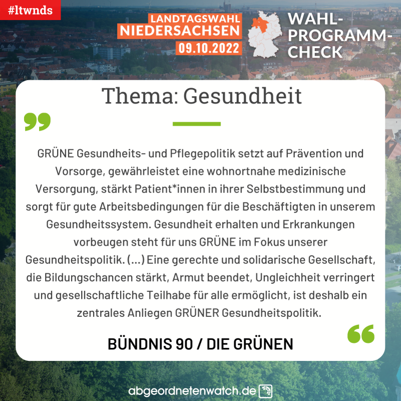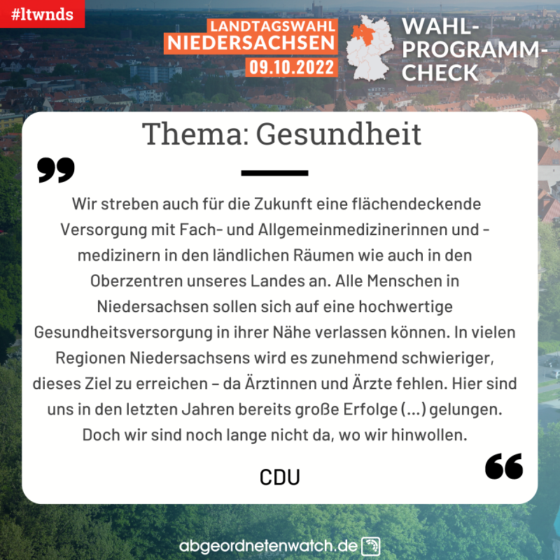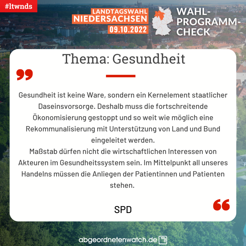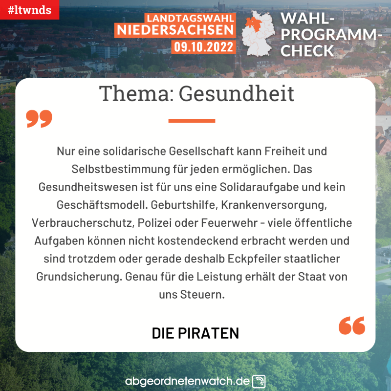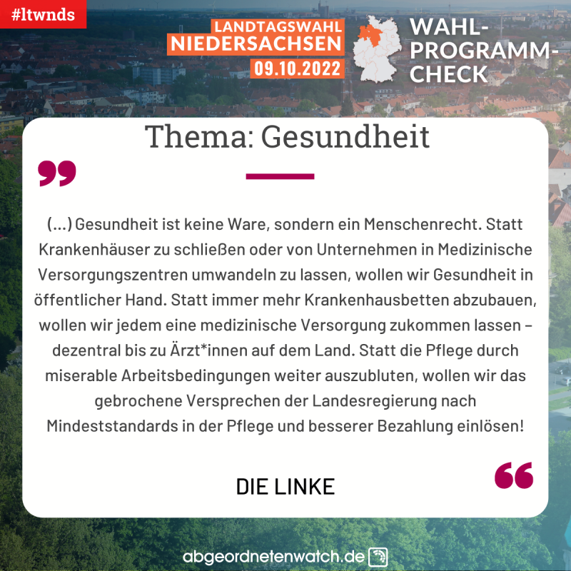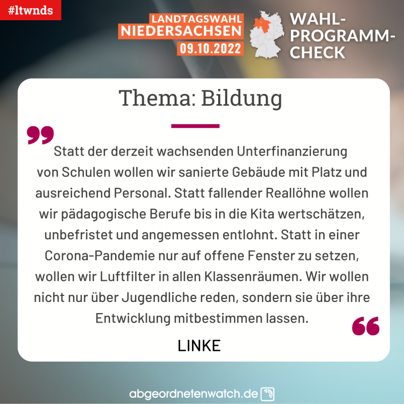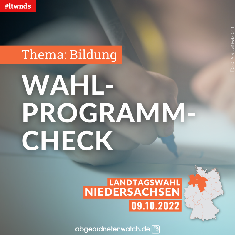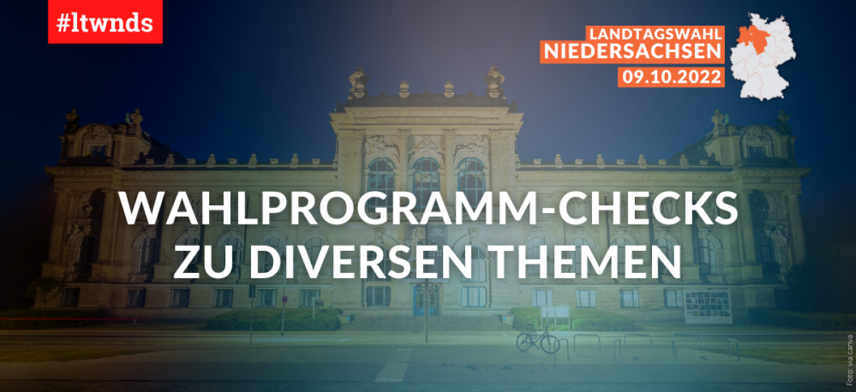 Wir haben die Wahlprogramme verschiedener Parteien zur Landtagswahl 2022 in Niedersachsen verglichen. Wie positionieren sie sich zu unterschiedlichen Themen? Das erfahren Sie in unseren Wahlprogramm-Checks!