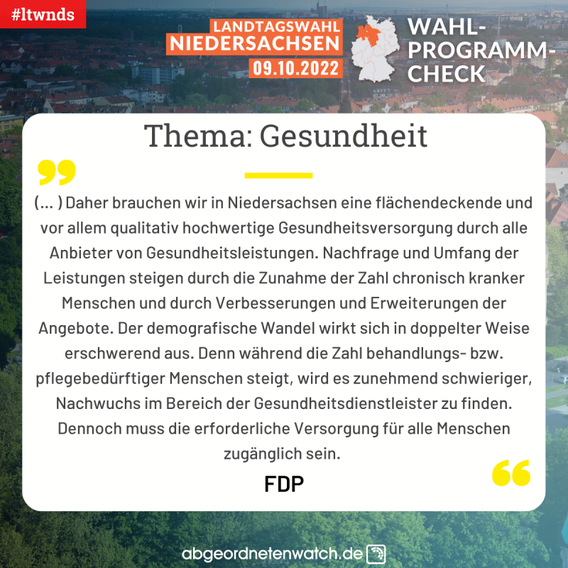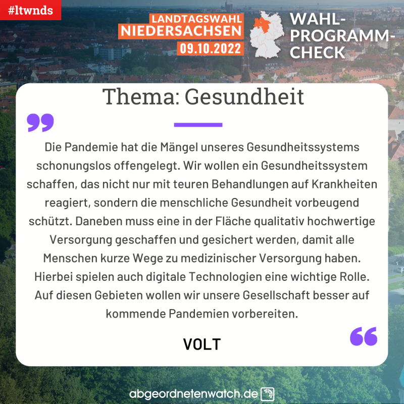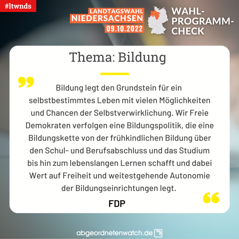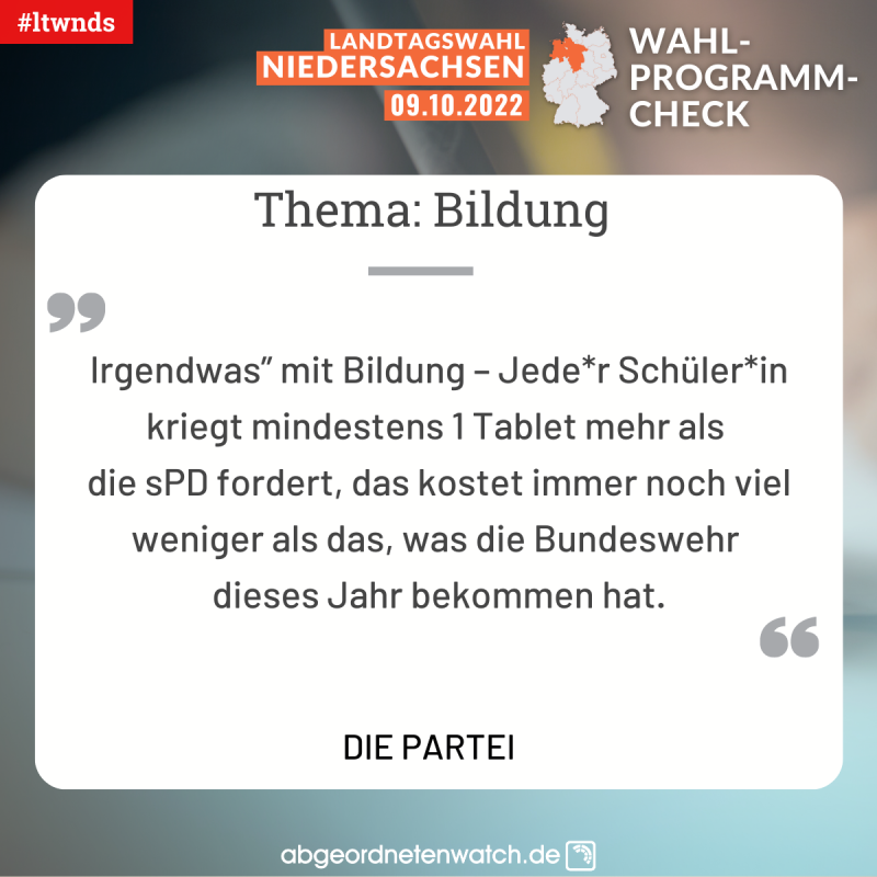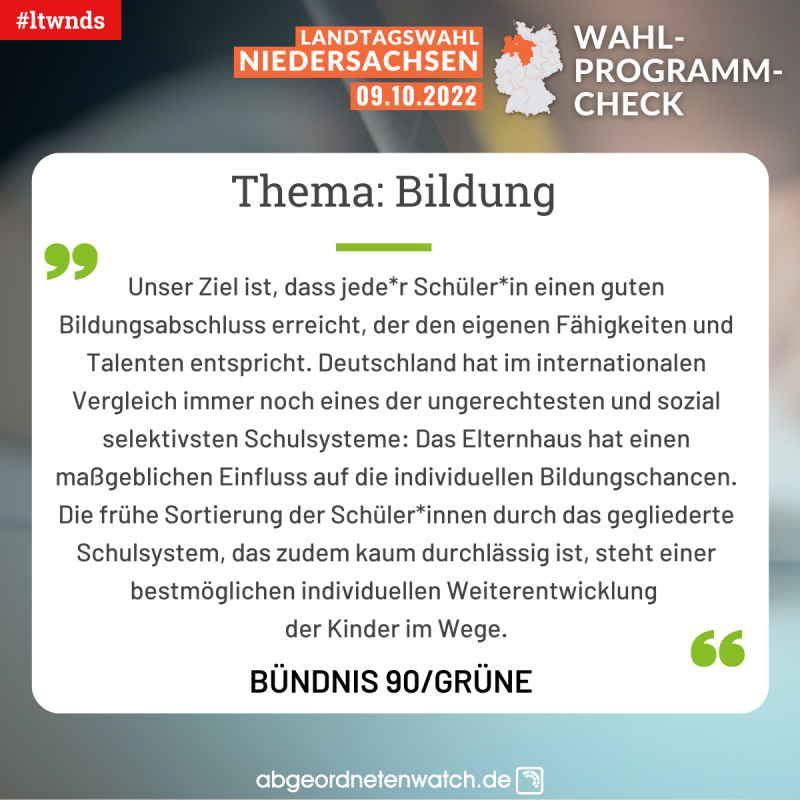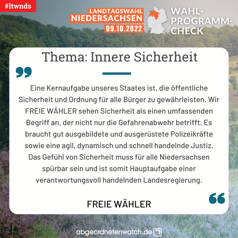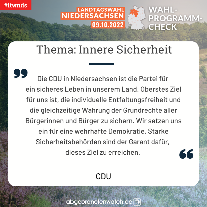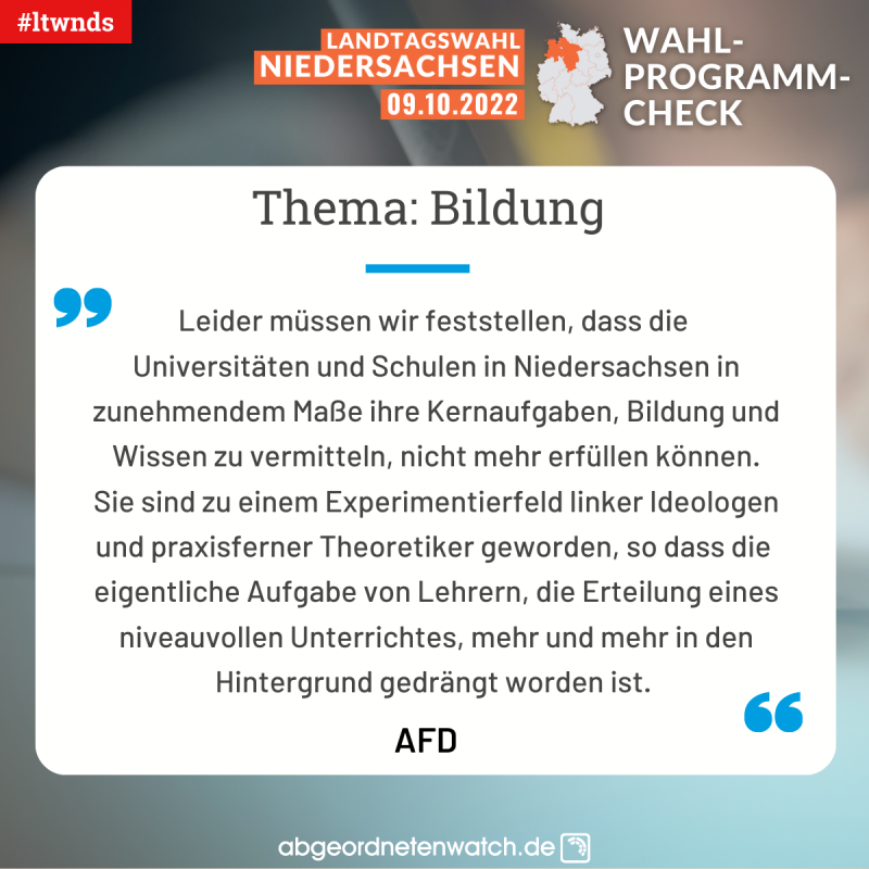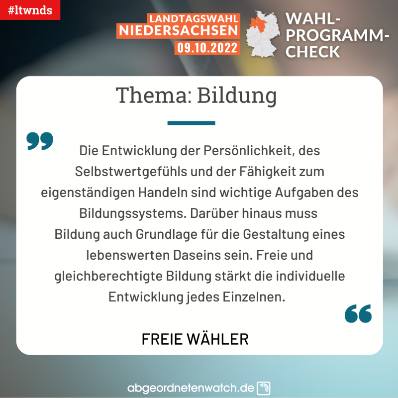 Wir haben die Wahlprogramme verschiedener Parteien zur Landtagswahl 2022 in Niedersachsen verglichen. Wie positionieren sie sich zu unterschiedlichen Themen? Das erfahren Sie in unseren Wahlprogramm-Checks!