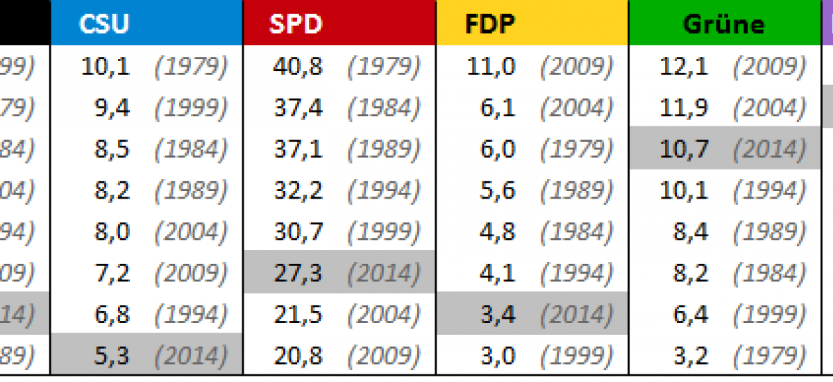 Auf unserer Facebookseite weist ein User darauf hin, dass die Ergebnisse der CSU vor der Wende nicht mit denen nach der Wende vergleichbar sind. Dies ist zutreffend, da die CSU als bayerische Regionalpartei in einem vereinigten Deutschland mehr Stimmen holen muss um bundesweit auf einen Prozentwert X zu kommen als in der alten Bundesrepublik. Allerdings ist das CSU-Ergebnis dieser Europawahl auch dann das mit großem Abstand schlechteste, wenn man nur den Stimmenanteil in Bayern zur Grundlage nimmt: