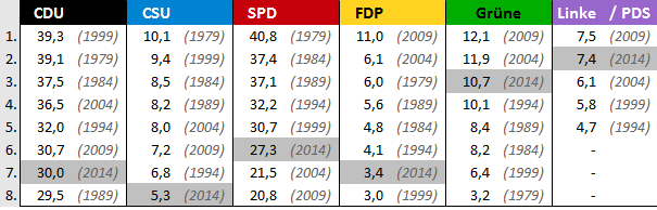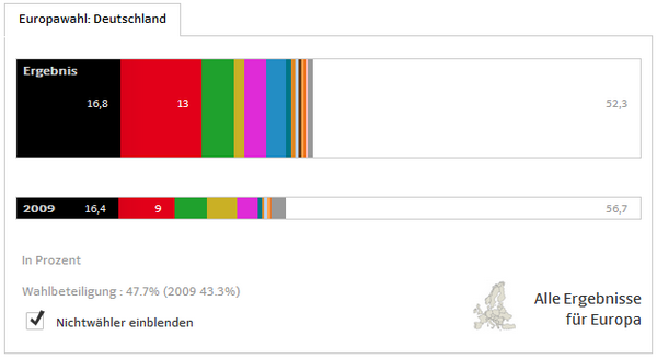 CDU/CSU und SPD präsentieren sich als Wahlsieger. Die Union verzeichnete den größten Stimmenanteil aller Parteien. Und die SPD hat knapp 7 Prozent im Vergleich zur Europawahl 2009 hinzugewonnen.Setzt man diese schlichten Tatsachen allerdings in den entsprechenden Kontext, ergibt sich - nun ja - ein recht bescheidenes Bild.