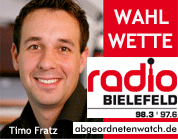 Wir unterbrechen das laufende Radio Bielefeld-Programm für eine wichtige Durchsage: Dies ist der nahezu letzte Aufruf für die Radio Bielefeld-Wahlwette. Herr Rainer Lux, Herr Björn Kerbein und Frau Brigitte Stelze - bitte begeben Sie sich sofort auf abgeordnetenwatch.de. Last call for Mr Rainer Lux, Mr Björn Kerbein and Mrs Brigitte Stelze. Please check in at abgeordnetenwatch.de! (...)