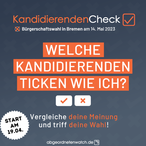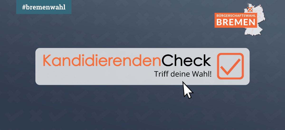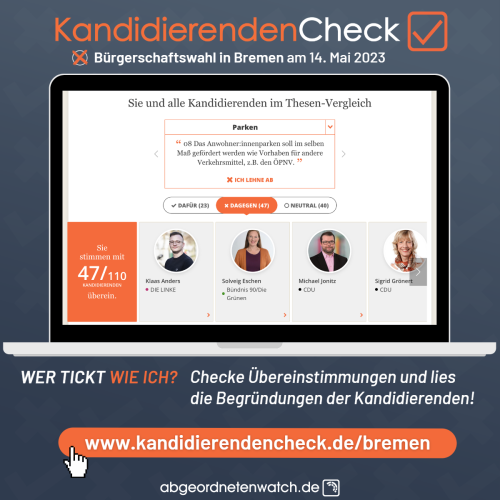 Am 14. Mai wählt Bremen. Um genau zu erfahren, welche Kandidat:innen genau zu Ihren Positionen und Meinungen passen, gibt es den Kandidierenden-Check von abgeordnetenwatch.de, die online personalisierte Wahlhilfe!