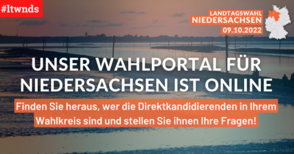 abgeordnetenwatch.de 1 Sep 2022 Wahl am 9. Oktober 2022 Unser Portal zur Landtagswahl in Niedersachsen ist online