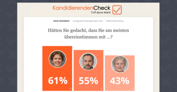 abgeordnetenwatch.de 11 Apr 2022 Persönliche Wahlhilfe für die Erststimme Wir starten unseren Kandidierenden-Check zur Landtagswahl in Schleswig-Holstein