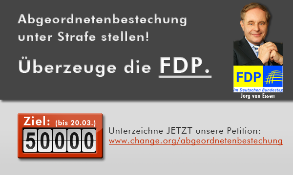 Im Oktober 2012 hatten wir Siegfried Kauder unseren Gesetzesvorschlag zur Strafbarkeit der Abgeordnetenbestechung zusammen mit mehr als 25.000 Unterschriften überreicht. Inzwischen ist er von einem erklärten Gegner eines solchen Gesetzes zu einem engagierten Befürworter geworden. Wir begrüßen die fraktionsübergreifende Initiative im Kampf gegen Korruption und fordern die FDP auf, dem Vorstoß der anderen Bundestagsfraktionen zu folgen und ihre Blockade aufzugeben. Als einzige Partei hat die FDP bisher keinen Vorschlag eingebracht.