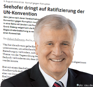 In einem Transparenz-Check hat abgeordnetenwatch.de in den letzten Wochen allen Direktkandidatinnen und -kandidaten zur Bundestagswahl die Gelegenheit gegeben, in Sachen Abgeordnetenbestechung folgende Selbstverpflichtung einzugehen: "Wenn ich in den Bundestag gewählt werde, setze ich mich für eine Gesetzesverschärfung ein." Von den 299 Unions-Kandidaten haben gerade einmal 25 die Selbstverpflichtung unterzeichnet. Unter den Befürwortern einer Gesetzesverschärfung befinden sich u.a. die CDU-Bundestagsabgeordneten Clemens Binninger, Reinhard Grindel, Axel Knoerig, Maria Michalk, Bernhard Schulte-Drüggelte, Uwe Schummer und Marco Wanderwitz - aber kein einziger Parlamentarier von Seehofers CSU.